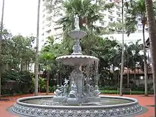 A cast-iron fountain was originally placed at the centre of the market under the clock tower, but in 1902 the fountain was moved to the front of the now demolished Orchard Road Market.[13] The fountain was moved again in 1930 to the Grand Hotel in Katong,[14] and later dismantled and forgotten. It was rediscovered in pieces in 1989 by a team responsible for the restoration works for Raffles Hotel. The fountain has since been reassembled and restored, and now forms the centrepiece of the Palm Garden at the Raffles Hotel.[13][15]