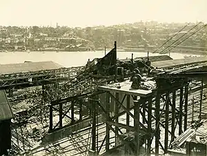 The second Lavender Bay Station was a redesign of the first station, and came into use on 27 April 1924. This station was necessary because a contract had been let for the construction of the Sydney Harbour Bridge and the Milsons Point land was required for workshops associated with the construction. The second Lavender Bay station was a terminus as the lines to Milsons Point were actually removed. Thus it was a more passenger-friendly version of its predecessor. The electric tram terminus was also moved to Glen Street on the cliff above the station.[2] Lifts and escalators, the first in Australia,[3] were installed.