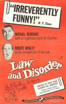 Law and Disorder is a 1958 British crime comedy film directed by Charles Crichton and starring Michael Redgrave, Robert Morley, Joan Hickson, and Lionel Jeffries.[1] It was based on the 1954 novel Smugglers' Circuit by Denys Roberts. The film was started by director Henry Cornelius, who died whilst making the film. He was replaced by Charles Crichton.[2]
