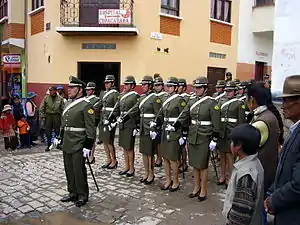 Law enforcement in Bolivia is reliant on the 40,000-member Cuerpo de Policía Nacional (National Police Corps) responsible for internal security and maintaining law and order.[3][4][5] Unlike many South American countries, the Bolivian police force always has been accountable to the national government rather than to state or local officials. The 1950 Organic Law of Police and Carabiniers officially separated the police from the military. Frequently, however, the national police call upon the military for assistance in quelling riots and civil protests.[3]