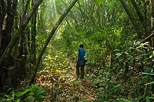 The forest of Lawachara is of a mixed type, with the understory usually composed of evergreens, including Quercus, Syzygium, Gmelina, Dillenia, Grewia, and Ficus. The upper canopy, meanwhile, is mainly composed of tall deciduous trees including Tectona, Artocarpus chaplasha, Tetrameles, Hopea odorata. Toona ciliata, and Pygenum. The original indigenous mixed tropical evergreen vegetation had been removed or replaced in the 1920s.[7] It is now mostly secondary forest with small remnant areas of rich primary forest.[2] In the undergrowth are bamboo groves of jai bansh (Bambusa burmanica) and muli bansh (Melocanna baccifera),[6] as well as several fern species and other epiphytes.