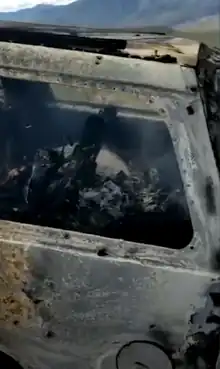 The gunman reportedly killed Christina Langford after she jumped out of her vehicle and waved her hands to display she wasn't a threat. She was discovered 15 yards from her vehicle with her 7-month-old baby uninjured in the vehicle.[26] Phone messages between family members showed the progression of discovering the incident. One message stated one of the cars was on fire with bullets all throughout it, and that there were people hiding in the bushes.[27] The burned out vehicle was discovered to hold the bodies of Miller-LeBarón, her 10-year-old daughter, 12-year-old son and infant twins, eleven miles from where the other two women were killed. The vehicle reportedly had broken down due to a flat tire, and was caused to explode by the amount of bullets fired into the vehicle.[28]