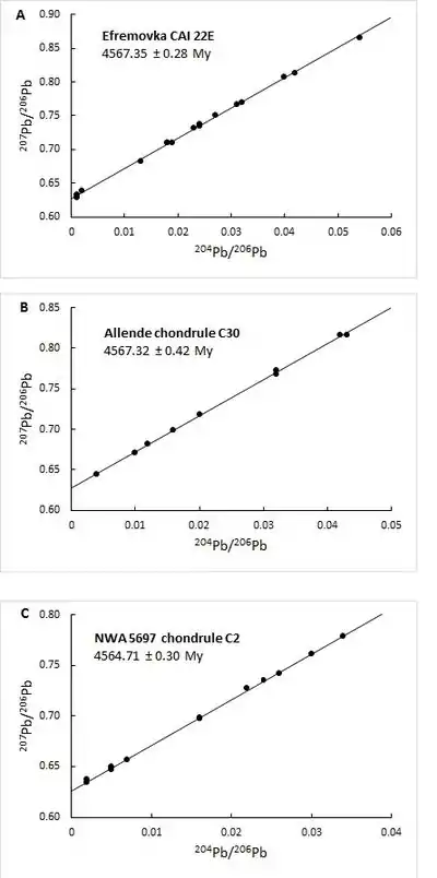 - ↑ Amelin, Y.; Krot, Alexander N.; Hutcheon, Ian D.; Ulyanov, Alexander A. (2002). "Lead Isotopic Ages of Chondrules and Calcium-Aluminum-Rich Inclusions". Science. 297 (5587): 1678–1683. Bibcode:2002Sci...297.1678A. doi:10.1126/science.1073950. PMID 12215641. S2CID 24923770.