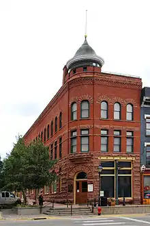 Richardsonian Romanesque[9] | The building's first occupant was the American National Bank. It has a 17-foot tower of red sandstone topped with a bell shaped metal painted dome.[18] |