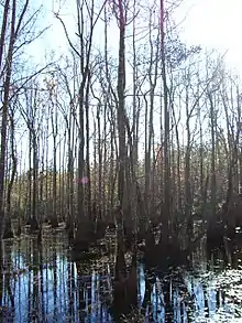 In 1984, 994 acres (4 km2) of the Leaf River Wildlife Management Area in southwestern Greene County 31°00′58″N 88°46′51″W / 31.01611°N 88.78083°W were designated wilderness. Almost the entire Leaf Wilderness consists of meandering sloughs, oxbow lakes, and spruce-pine forest or oak-gum-cypress river bottom. Loblolly and shortleaf pines are found in abundance, with a dense understory of dogwood, redbud, persimmon, blueberry, honeysuckle, and poison oak. Common wildlife include white-tailed deer and wild turkey.[1]