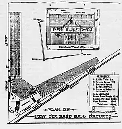 After a season and a half of playing in the charred ballpark, the Reds built what they expected to be a more permanent new grandstand, again in the southwest corner, retaining the original seating, and again with a gap between the seating areas that would prove fortuitous. The original seating had changed somewhat over time, as the middle section no longer sat higher than the rest (it had been rebuilt in 1894 to be leveled with the rest of the grandstand), and the entire structure was roofed.[3]