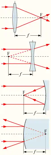 The focal point F and focal length f of a positive (convex) lens, a negative (concave) lens, a concave mirror, and a convex mirror.