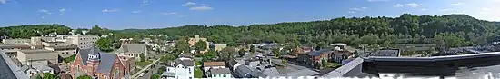 ![]() Panoramic view facing east showing approximately 180 degrees of downtown Leechburg from on top of the highrise located at 2nd and Main Street |