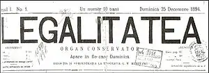 Legalitatea was a weekly newspaper published in Bârlad, Romania. The newspaper, covering political, economic and literary topics, was first printed on December 16, 1882, at the G.V. Munteanu printing shop. The last number of the newspaper was printed on January 1, 1884.