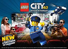 Lego City 4D - Officer in Pursuit is a 4-D animated short film attraction based on Lego City. It was released in Legoland California on 12 April 2019 and then rolled out to other Legoland parks and Legoland Discovery Centres in 2019. The film has a runtime of 12 minutes and uses a variety of sensory effects to enhance the experience. The plot focuses on the Lego City police as they pursue a robber in a high-speed chase through the streets of the city. The film was produced by Pure Imagination Studios and distributed by The Lego Group.