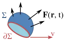 Figure 1: A vector field F(r, t) defined throughout space, and a surface Σ bounded by curve ∂Σ moving with velocity v over which the field is integrated.