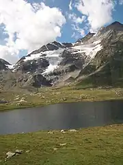Lej Nair (literally "black lake" in Romansh) is a small lake on Bernina Pass in the canton of Grisons, Switzerland. It is located near the summit of the pass, between Lago Bianco ("white lake") and Lej Pitschen ("small lake"). While Lago Bianco drains to the Adriatic Sea, Lej Nair and Lej Pitschen are part of the basin of the Inn River draining into the Black Sea.