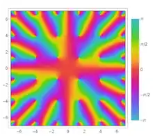 The sl function has simple zeros at Gaussian integer multiples of ϖ, complex numbers of the form for integers a and b. It has simple poles at Gaussian half-integer multiples of ϖ, complex numbers of the form , with residues . The cl function is reflected and offset from the sl function, . It has zeros for arguments and poles for arguments with residues