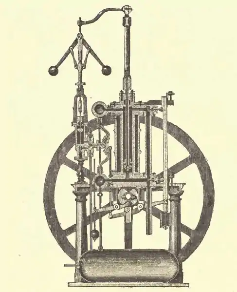 The engine depicted uses a centrifugal governor to control the speed of the engine. Early internal combustion engines did not have the benefit of a throttle, and with separate air and gas pumps and the need to keep the gas/air mixture is a specific range to achieve reliable ignition and combustion, the control of speed was significantly different from steam engines. For this reason many early engines operate on a hit-and-miss principle, either a full charge of gas and air or no gas at all.