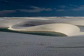 The sand is carried to the park from the interior of the continent by the Parnaíba and Preguiças rivers, where it is then driven back inland up to 50 kilometres (31 mi) by winds, creating a series of sand dunes rising as much as 40 metres (130 ft) tall.[3] During the rainy season, between the months of January and June, the rainstorms fill the spaces among the dunes with fresh water lagoons of up to 100 metres (330 ft) in length and 3 metres (10 ft) in depth, and together comprising as much as 41% of the area of the park.[4][6] The water in the lagoons is prevented from draining by a layer of impermeable rock located beneath the sandy surface.[2] The lagoons typically have a temperature between 27.5 °C (81.5 °F) and 32 °C (90 °F), pH of between 4.9 and 6.2, and low levels of dissolved nutrients.[7] When the dry season returns, the pools quickly evaporate, losing as much as 1 metre (3 ft) of depth per month.[6]