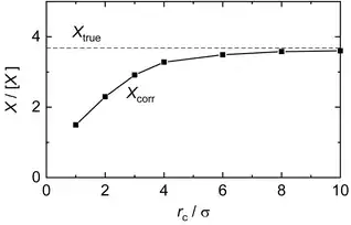Different corrections schemes have been developed to account for the influence of the long-range interactions in simulations and to sustain a sufficiently good approximation of the 'full' potential.[7][32] They are based on simplifying assumptions regarding the structure of the fluid. For simple cases, such as in studies of the equilibrium of homogeneous fluids, simple correction terms yield excellent results. In other cases, such as in studies of inhomogeneous systems with different phases, accounting for the long-range interactions is more tedious. These corrections are usually referred to as 'long-range corrections'. For most properties, simple analytical expressions are known and well established. For a given observable , the 'corrected' simulation result is then simply computed from the actually sampled value and the long-range correction value , e.g. for the internal energy .[32] The hypothetical true value of the observable of the Lennard-Jones potential at truly infinite cut-off distance (thermodynamic limit) can in general only be estimated.