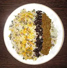 Lentil rice (Persian: عدسپلو) is a well-known dish in the Middle East. It is almost always cooked with raisins and sometimes served with dates or meat, but rarely with both.[1][2]
