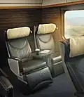 Initially, LEO Express operated five Stadler Flirt five-car electric multiple units, which have been specially adapted to perform long-distance services.[4] These have been claimed by the company to provide the fastest acceleration of any train operating in the Czech Republic, achieved via its modern and lightweight design and relatively powerful engines; these are also capable of attaining the maximum national speed of 160km/h.[10] The interior has been designed for intercity travelers, and has been configured to provide three travelling classes: Economy, Business and Premium. In Premium Class, the seats are foldable to a sleeping position.[25] Various amenities are present on these trains, including full air conditioning, Wi-Fi coverage, information and entertainment systems, onboard catering, ecologically closed toilets, wheelchair-accessible facilities, and daily newspapers and magazines.[10][26] The livery used by LEO Express is predominantly black with golden details, along with the company's white logo being placed in prominent locations. On 5 February 2012, the first of these trains was formally delivered to the company.[27]
