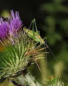Leptophyes albovittata is a species belonging to the family Tettigoniidae, subfamily Phaneropterinae. It is found in Europe east of France and Spain.[2] mainly in Eastern Europe . To the west, the border runs along the line Würzburg-Nördlingen-Munich. The species feeds on delicate and soft-leaved plants, such as chickweed, dandelion and Lathyrus.