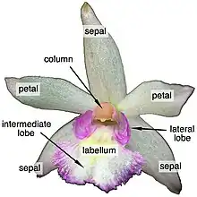 The appearance of the petals and sepals is similar, both are elongated although the petals are slightly more narrow. Flower colors are generally greenish, white or variable shades of pink and the labellum (a special petal attractive to pollinators) can be spotted in pale yellow, light purple or lilac. The labellum is located along the column and trilobed (three lobes). The lateral lobes are small and raised beside the column, although never involving it. The intermediate lobe is much bigger and quite variable between species. They can have either lanceolate or obovate shape, occasionally be fleshy, flat or bending backwards; in some species they have denticulated edges but are smooth in others. Rarely, calli are present, with claws holding them attached to the sides of the column. The column is short, thick and erect, normally greenish, biauriculated, and bears six pollinia of different sizes, two larger in the center and four smaller in two pairs held by a short caudicle in an arrangement that is unique among orchids. Their fruits are rounded, succulent and have a perfume reminiscent of vanilla.[4]