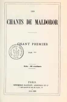 Les Chants de Maldoror (The Songs of Maldoror) is a French poetic novel, or a long prose poem. It was written and published between 1868 and 1869 by the Comte de Lautréamont, the nom de plume of the Uruguayan-born French writer Isidore Lucien Ducasse.[1] The work concerns the misanthropic, misotheistic character of Maldoror, a figure of evil who has renounced conventional morality.