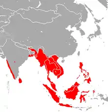 Megaderma spasma is from the order Chiroptera and family Megadermatidae which comprises four genera and five species.[6][4] M. spasma also known as lesser false vampire.[5][3][7] Its type locality was in Indonesia, Molucca Islands and Ternate.[7] There are two specimens of M. spasma[8] collected in Sarawak Museum Unimas, one from Niah and another one from batu 16, Ulu Gombak. M. spasma was distributed in India to Indochina and Malay Peninsula, Sri Lanka, Andaman Islands, Sumatra, Borneo, Moluccas, Philippines, Sulawesi and other Indonesian islands.[5][3][7] In Borneo, it can found in Sepilok, Darvel Bay area in Sabah, Niah and Kuching in Sarawak, upper S. Kapuas in West and upper S. Tengah in South Kalimantan.[3] It is most closely related to the greater false vampire bat, which is the only other species in the genus Megaderma.
