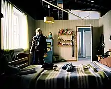 A key passage in the novel details what happens when a vampire enters a room uninvited, an action that traditional vampire lore usually prohibits.[15] Alfredson originally wanted to omit this from the film, but Ajvide Lindqvist was adamant that it had to be included.[14] Alfredson was initially nervous about the scene. He realized in post-production that the sound effects and music made it "American, in a bad way", and had to be removed for the scene to work.[16] The result, which shows Eli slowly beginning to bleed from her eyes, ears, and pores, received positive notices from many critics.[17][18][19] Peter Bradshaw of The Guardian described it as a "haemophilia of rejection".[15]