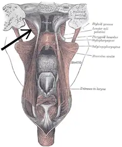 During its course from its origin to its insertion, the muscle passes medial to the superior margin of the superior pharyngeal constrictor muscle.[2]