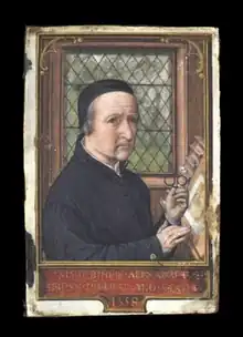 Teerlinc was born in Bruges, Flanders (which is now a part of Belgium) in the 1510s, one of five daughters of renowned miniaturist Simon Bening and granddaughter of Catherine van der Goes (closely related to Hugo van der Goes) and Alexander Bening.[3][4] After marrying George Teerlinc of Blanckenberge in 1545, Teerlinc left for England, and is documented there by 1546, when she became court painter to the Tudor court, serving Henry VIII, Edward VI, Mary I, and Elizabeth I. She received an annual salary of £40 from 1546 until her death in 1576, as granted by Henry VIII[5] and recorded by Lodovico Guicciardini (1567),[5] which was more than was provided to Holbein.[6] She was the only female painter in the court of Henry VIII,[7] although Catherine Parr was said to have employed three women miniature painters and these were Susannah Hornebolt, Levina Teerlinc and Margaret Holsewyther.[8]