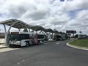 The Lewes Transit Center is located southwest of the city of Lewes in Sussex County, Delaware. The transit center is located along the south side of U.S. Route 9/Delaware Route 1 (Coastal Highway) a short distance east of the Five Points intersection, with access from the southbound lanes.[1][2] The park and ride is located at the northern edge of the Delaware Beaches region, allowing for transfer to bus services before motorists reach heavier traffic along DE 1 approaching Rehoboth Beach. Buses utilize bus lanes along DE 1 between the Lewes Transit Center and Rehoboth Beach, bypassing traffic congestion.[3] The Lewes Transit Center features a bus loop that buses pull into, to pick up and drop off passengers. Located south of the bus stop is a park and ride lot with 248 parking spaces along with an indoor passenger facility featuring seating, restrooms, a ticket sales office, and monitors displaying real-time bus information. Other amenities at the Lewes Transit Center include bicycle racks, benches that feature solar-powered charging stations, and an electric vehicle charging station.[2][3]
