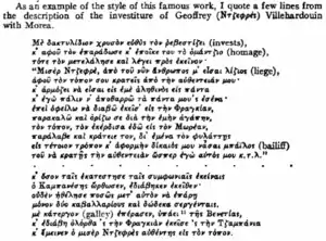 - ↑ P. Zepos, "Το δίκαιον εις το Χρονικόν του Μορέως (The Law in the Chronicle of the Morea)", Επετηρίς Εταιρείας Βυζαντινών Σπουδών (Annals of the Society for Byzantine Studies) 18(1948), 202-220, in Greek