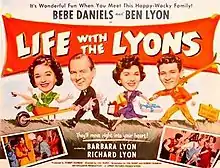 Life with the Lyons is a 1954 British comedy film directed by Val Guest and starring Bebe Daniels, Ben Lyon and Barbara Lyon. It was a spin-off from the radio series Life with the Lyons, and the screenplay was based on previous episodes from the show.[3] It was shot at Southall Studios in London with sets designed by the art director Wilfred Arnold.