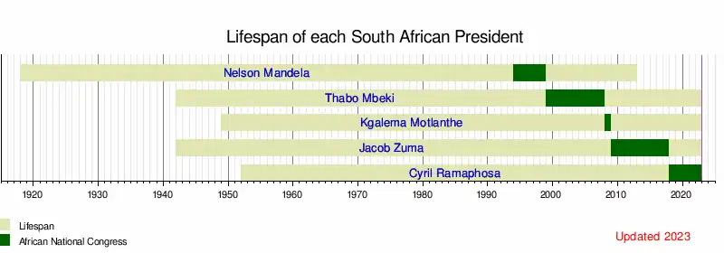 This is a graphical lifespan timeline of presidents of South Africa. The presidents are listed in order of office.[1][2]