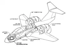 The Avro Canada Avrocar, commissioned by the USA, was intended to be a technology demonstrator for a supersonic VTOL aircraft. It featured a single central fan in a circular flying wing, with engine thrust directed rearwards for forward flight. It underwent trials between 1958 and 1961 but, due to its unstable "flying saucer" aerodynamics and lower than expected thrust, never flew out of ground effect. The Verticraft Verticar of 1961 was a similar single-fan, directed-thrust, all-wing (or lifting body) aircraft, of conventional but very low-aspect-ratio wing planform. It failed to fly. A tandem-fan version was proposed but never built.[5] By contrast the Ryan XV-5 Vertifan of 1964 was an otherwise conventional delta-wing jet. It had a large fan in each wing and a third, smaller fan in the nose to provide balance in pitch. It was more successful, with one of the two prototypes flying until 1971.