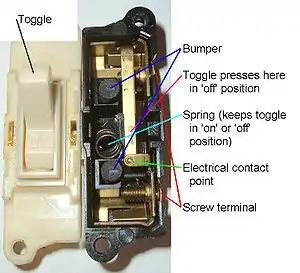 The toggle mechanism provides "snap-action" through the use of an "over-center" geometry. The design was patented in 1916 by William J. Newton and Morris Goldberg.[2] The switch actuator does not control the contacts directly, but through an intermediate arrangement of springs and levers. Turning the actuator does not initially cause any motion of the contacts, which in fact continue to be positively held open by the force of the spring. Turning the actuator gradually stretches the spring. When the mechanism passes over the center point, the spring energy is released and the spring, rather than the actuator, drives the contacts rapidly and forcibly to the closed position with an audible "snapping" sound. This mechanism is safe, reliable, and durable, but produces a loud snap or click.