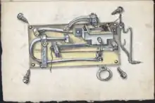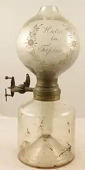 The first lighters were converted flintlock pistols that used gunpowder. In 1662 the Turkish traveller Evliya Çelebi visited Vienna as a member of an Ottoman diplomatic mission and admired the lighters being manufactured there: "Enclosed in a kind of tiny box are tinder, a steel, sulphur and resinous wood. When struck just like a firearm wheel the wood bursts into flame. This is useful for soldiers on campaign."[1] One of the first lighters was invented by a German chemist named Johann Wolfgang Döbereiner in 1823 and was often called Döbereiner's lamp.[2] This lighter worked by passing flammable hydrogen gas, produced within the lighter by a chemical reaction, over a platinum metal catalyst which in turn caused it to ignite and give off a great amount of heat and light.[3]