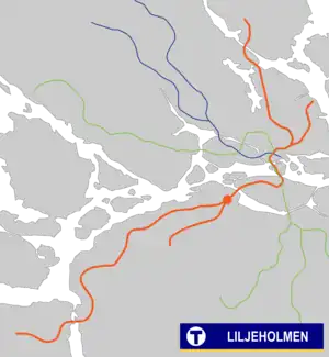 Liljeholmen was opened on 5 April 1964 as part of the first stretch of the Red line, between T-Centralen and Fruängen, with a branch to Örnsberg.[2] It was a surface-level station with two platforms and only one exit at the southern part of the station, where it was a bus terminal. But since 2000, there is also a second exit towards the north part of Liljeholmen, which is connected to the Tvärbanan tramway station Liljeholmen. In the beginning of the 2000s (decade), the station was rebuilt to an indoor-station (though still above ground), with a new 3rd platform for trains towards Fruängen/Norsborg, which is connected to a new underground-bus-terminal, and above the station, new squares and houses were built.[3]