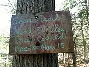 Notable features include the Hanover Road parking lot and boat launch, semi-obscured (by trees) scenic views of Pond Brook inlet and Lake Lillinonah (Housatonic River), a climb to a high point of 480-foot (150 m), a very large oak tree, several stone fences and foundations and a demonstration of a maple sugaring technique known as "sugarbush" near the Echo Valley Road parking lot.[2] The Lillinonah Trail is maintained largely through the efforts of the Connecticut Forest and Park Association and the Newtown Forest Association.