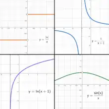 has no limit at x0 = 1 (the left-hand limit does not exist due to the oscillatory nature of the sine function, and the right-hand limit does not exist due to the asymptotic behaviour of the reciprocal function, see picture), but has a limit at every other x-coordinate.