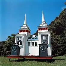 The cover art depicts a shrine built by Brian Dewan, and photographed by Carol Kitman.[7] Two slightly different versions of the cover photograph exist: one that was used for domestic releases, and another that was used for all releases outside the United States, with the exception of the Australian releases and Italian CD. The two men pictured behind the lecterns in the shrine are John Linnell's great-grandfather, Lewis T. Linnell (left) and Flansburgh's maternal grandfather, Brigadier General Ralph Hospital (right).[9][10]