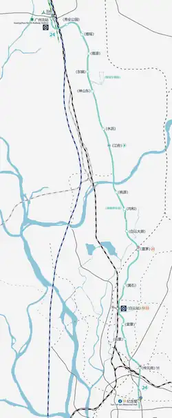 Line 24 of Guangzhou Metro is an under construction rapid transit line in Guangzhou, Guangdong Province, China. The whole line runs roughly from north to south, connecting Huadu District, Baiyun District, Yuexiu District and Haizhu District, and connects two railway hubs, Guangzhou North railway station and Guangzhou Baiyun railway station.[1] Line 24 will use 6-car Type A trains similar to Line 8.[2]