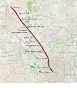 Line S3, a radial route, runs from Saronno in a south easterly direction, via the Milan–Saronno railway, to Milano Cadorna, the railway's urban terminus.[2] The travel takes 35 minutes.[3]