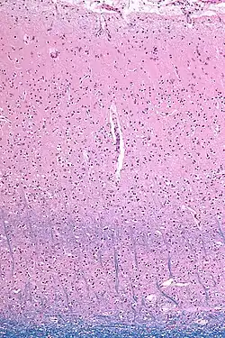 ![]() Micrograph showing the visual cortex (predominantly pink). The blue, horizontal band in the lower half of the image are the bands of Baillarger/the line of Gennari. Subcortical white matter (predominantly blue) is seen at the very bottom of the image. LFB stain. | |