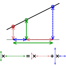 In this geometric visualisation, the value at the green circle multiplied by the horizontal distance between the red and blue circles is equal to the sum of the value at the red circle multiplied by the horizontal distance between the green and blue circles, and the value at the blue circle multiplied by the horizontal distance between the green and red circles.