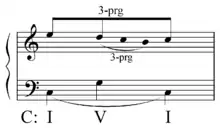 In music, a linear progression (Auskomponierungszug or Zug, abbreviated: Zg.) is a passing note elaboration involving stepwise melodic motion in one direction between two harmonic tones.[2] "The compositional unfolding of a specific interval, one of the intervals of the chord of nature."[3] For example: