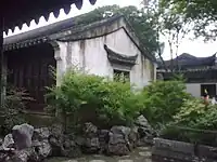 A complex and unique structure composed of a courtyard, open 3 bay hall, and covered corridor which functions as a single space. The courtyard is planted with two trees symbolizing jade (Magnolia soulangia) and gold (Osmanthus fragrans), a sign of prosperity. The entry to this space is marked by a tablet inscribed by Deputy Prime Minister Zhu Boqi which read, "Paradise on Earth".[2] |