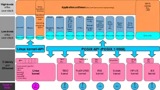 The Linux API includes the kerneluser space API, which allows code in user space to access system resources and services of the Linux kernel.[3] It is composed of the system call interface of the Linux kernel and the subroutines in the C standard library. The focus of the development of the Linux API has been to provide the usable features of the specifications defined in POSIX in a way which is reasonably compatible, robust and performant, and to provide additional useful features not defined in POSIX, just as the kerneluser space APIs of other systems implementing the POSIX API also provide additional features not defined in POSIX.