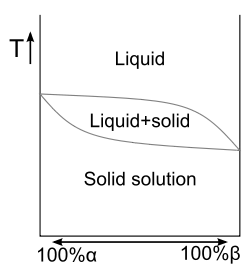 The equilibrium phase diagram of a solid solution of made up of mixtures of α and β. The upper curve is the line of liquidus, and the lower curve is the line of solidus.