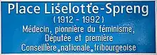 Liselotte Spreng (15 February 1912 in Biel/Bienne, canton of Berne – 25 November 1992 in Villars-sur-Glâne, canton of Fribourg) was a Swiss women's rights activist and politician. She was the first female National Councillor from the canton of Fribourg.