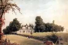 During the War of 1812, guards of the local militia were stationed in the neck to prevent a landing by the British fleet blockading the Sound. An incident erupted as the result of a relatively innocent encounter between an English landing party in search of fresh food and American sentries. Additional men were moved in and quartered in barns on the neck. The ensuing events, renowned locally as the Battle of Davenport's Neck, involved a false alarm that caused the entire militia to flee the area mistakenly believing they were under attack. In 1814, Newberry Davenport divided the neck between his two sons, Newberry Davenport, Sr. and Lawrence Davenport. Lawrence erected a house on his section in 1816, later known as Davenport Grange and the old Lispenard–Rodman House became the house of Newberry, Jr. This began a process whereby both branches of the family sold large plots of acreage to wealthy persons who established handsome homes and estates on the neck. About this time, Newberry Davenport, Jr. would have added the kitchen wing to the old house, continuing the stone fabric and gable roof of the main house. The grade level of the land around the house may have begun to be heightened at this time as access to the original basement kitchen was closed-off. There is no other evidence of the house changing significantly at this time. Newberry Dayenport, Jr. died in 1863, leaving his house and remaining estate to his two unmarried children, Lawrence Montgomery Davenport and Anna Davenport. Based on the financial successes of their predecessors, the later Davenports enjoyed a comfortable leisurely lifestyle, traveling to Europe, providing community services and participating in the sophisticated social circle that had enveloped around the prominent estates built in the neck. Lawrence M. Davenport had Alexander Jackson Davis design the neighboring San Souci. By 1865, he had sold it to Mrs. Anthony Walton White Evans, who hired Davis to design additions in 1871. The Davenports continued to sell property to the growing number of people searching for country seats on Long Island Sound.[8]